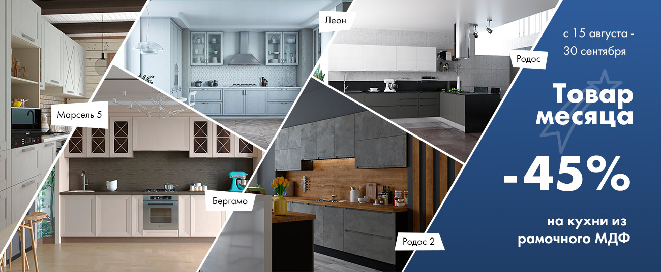 Фабрика ЗОВ проводит акцию «Товар месяца» с 15.08.2018 по 30.09.2018 года, и предоставляет скидку -45% на кухни с фасадами: