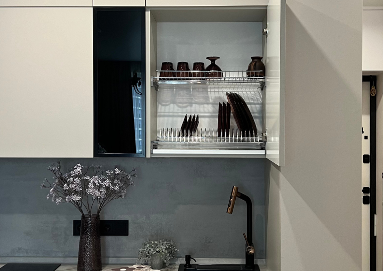 Эргономика гарнитура продумана до мелочей: система скрытого хранения и интегрированные ручки сохраняют чистоту поверхностей, а высокие шкафы предоставляют максимум полезного места для техники и утвари.